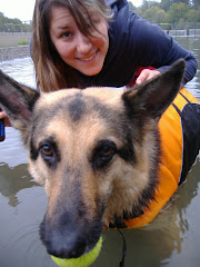Until very recently, I always had Ali wear his "float coat" (Ruff Wear makes a good one, modeled by Ali here) when in the river as a safety precaution, just in case. And if you are trying to get your dog in a pond, lake, or river for the first time, enter the water with him and hold onto the life vest until you are absolutely sure of his ability. It was a long time before I was comfortable standing on the shore tossing the ball for Alec.